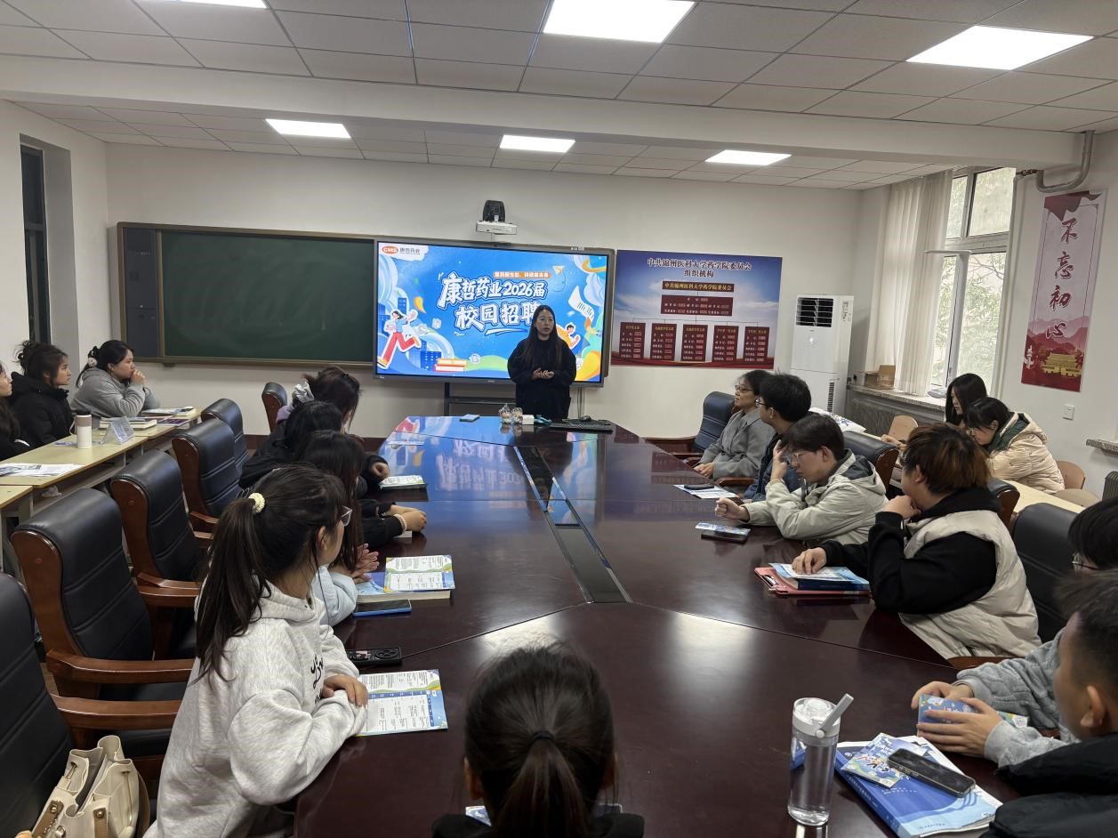 为拓宽毕业生就业渠道,助力学生高质量就业,10月17日,药学院召开深圳康哲药业2026届毕业生专场招聘宣讲会。药学院毕业年级辅导员董欣、姜文玉及学生代表参与活动。